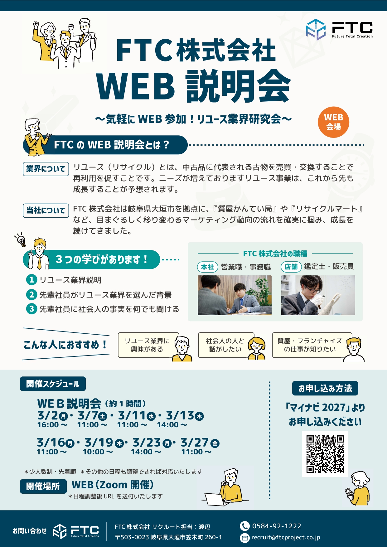 「FTCってどんな会社?」「どんな職種があるの?」など、当社の事業や具体的な仕事内容のほか、リユース業界や全国230店舗以上を展開する当社のフランチャイズビジネス「営業」の仕組みなどをお話します!